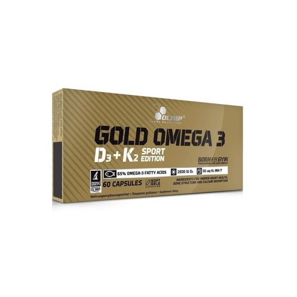 Gold Omega 3 D3+K2 Sport Edition компании Olimp — диетическая добавка с высоким содержанием омега-3 с витаминами D3 и K2. Превосходное мелкодисперсное рыбье масло с 65%-ной концентрацией со стандартизованным содержанием омега-3 жирных кислот, дополняющих диету необходимыми жирными кислотами. Gold Omega 3 D3+K2 Sport Edition также содержит большое количество натурального витамина К, в его наиболее усвояемой и активной форме — менахинон-7 (витамин K2). Продукт был дополнен 2000 МЕ витамина D (D3). Омега-3 EPA (эйкозапентаеновая кислота) и DHA (докозагексаеновая кислота) способствуют правильному функционированию сердца (положительный эффект достигается, когда потребление равно 250 мг EPA и DHA в день). Витамины D и K помогают поддерживать правильное функционирование сердечно-сосудистой системы — витамин К способствует нормальной коагуляции крови, а витамин D помогает поддерживать нормальный уровень кальция в крови. Витамин D также играет роль в поддержании здоровых костей и зубов, способствует правильному всасыванию кальция и фосфора и обеспечивает надлежащее функционирование иммунной системы. Витамин К также способствует поддержанию здоровых костей.